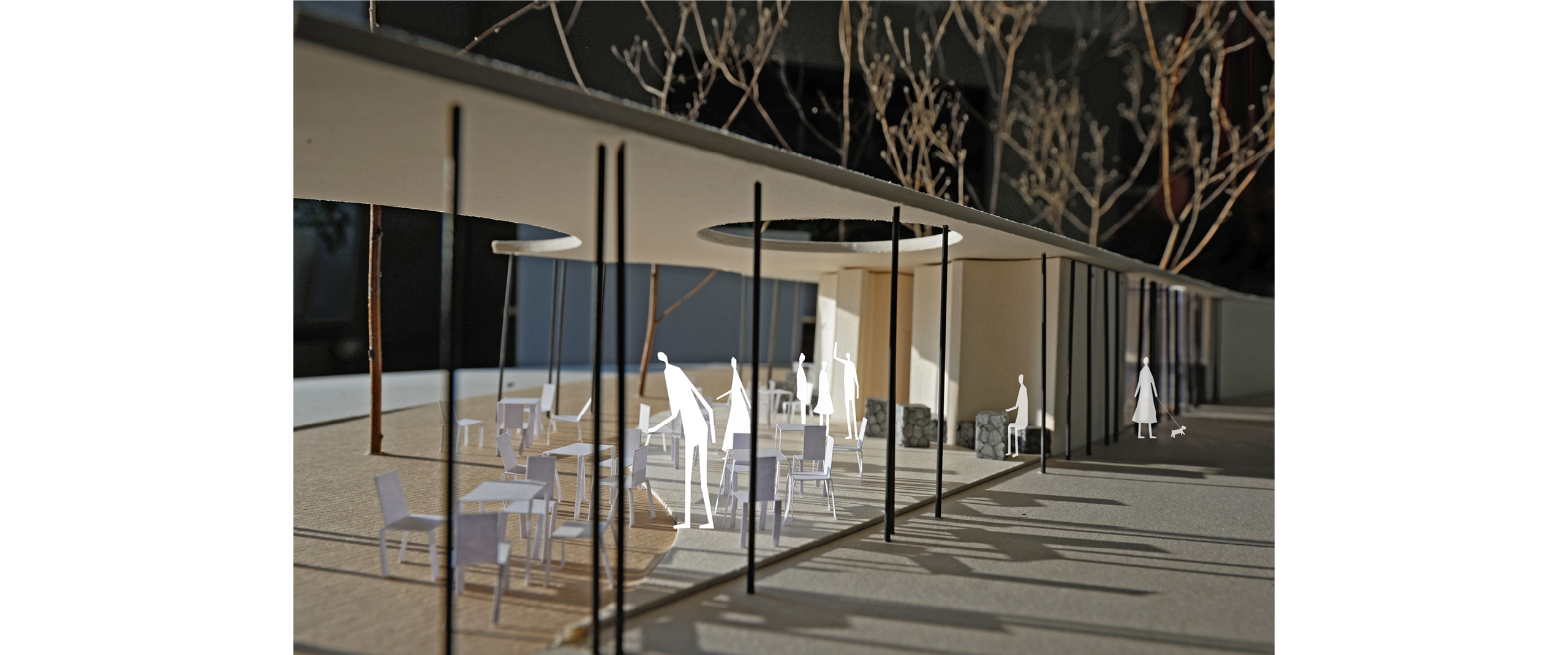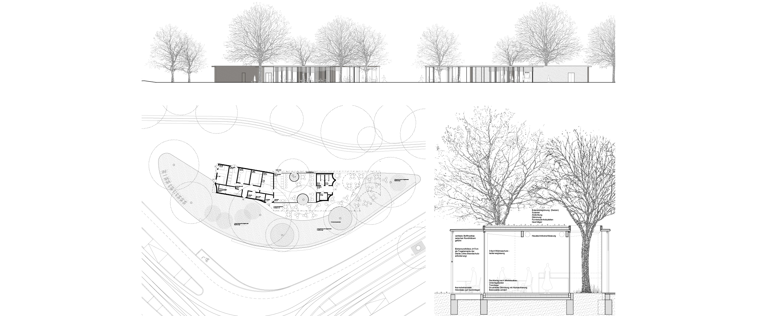 Die opake Aussenwand weicht stellenweise zurück und bildet Nischen zum Sitzen. Ausrundungen im Dach geben den Baumkronen Raum für ihre Entwicklung und ermöglichen zugleich das Erleben des Schattenspiels auch unterhalb der überdachten Bereiche.