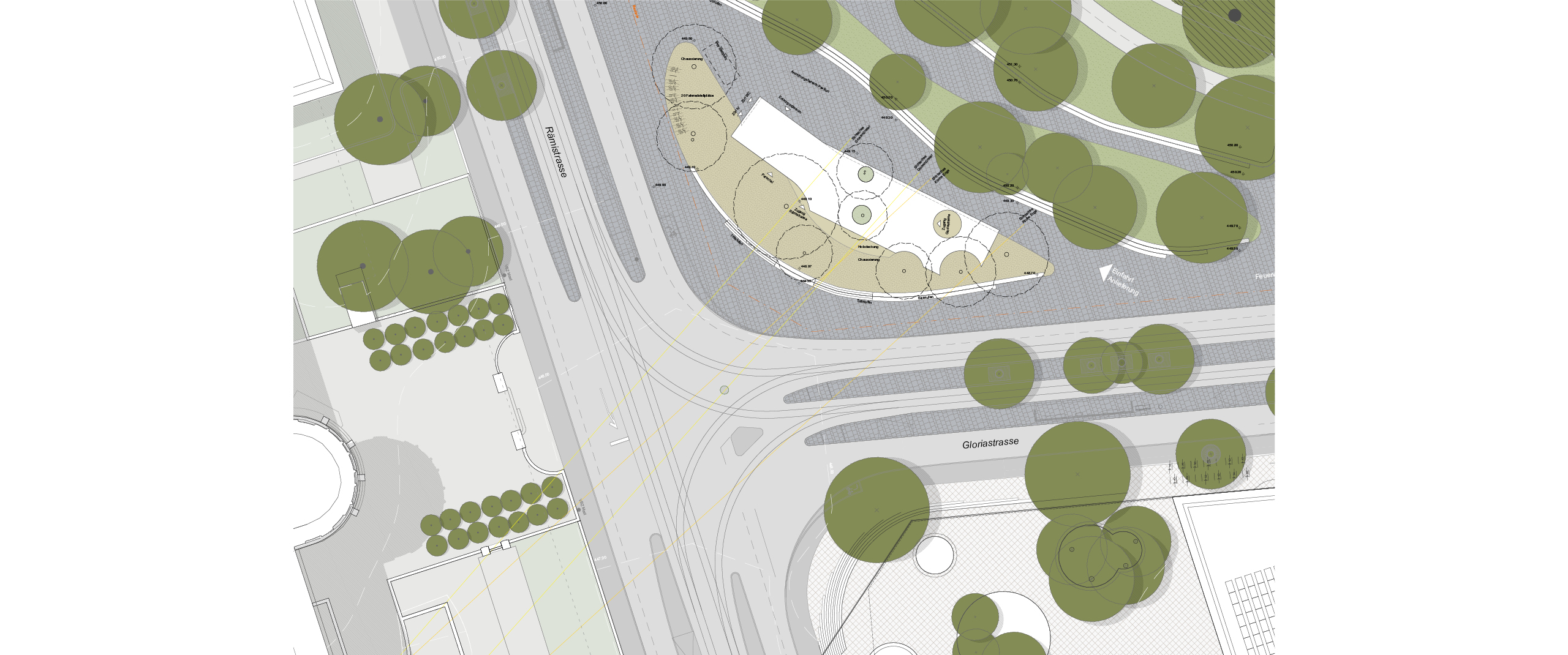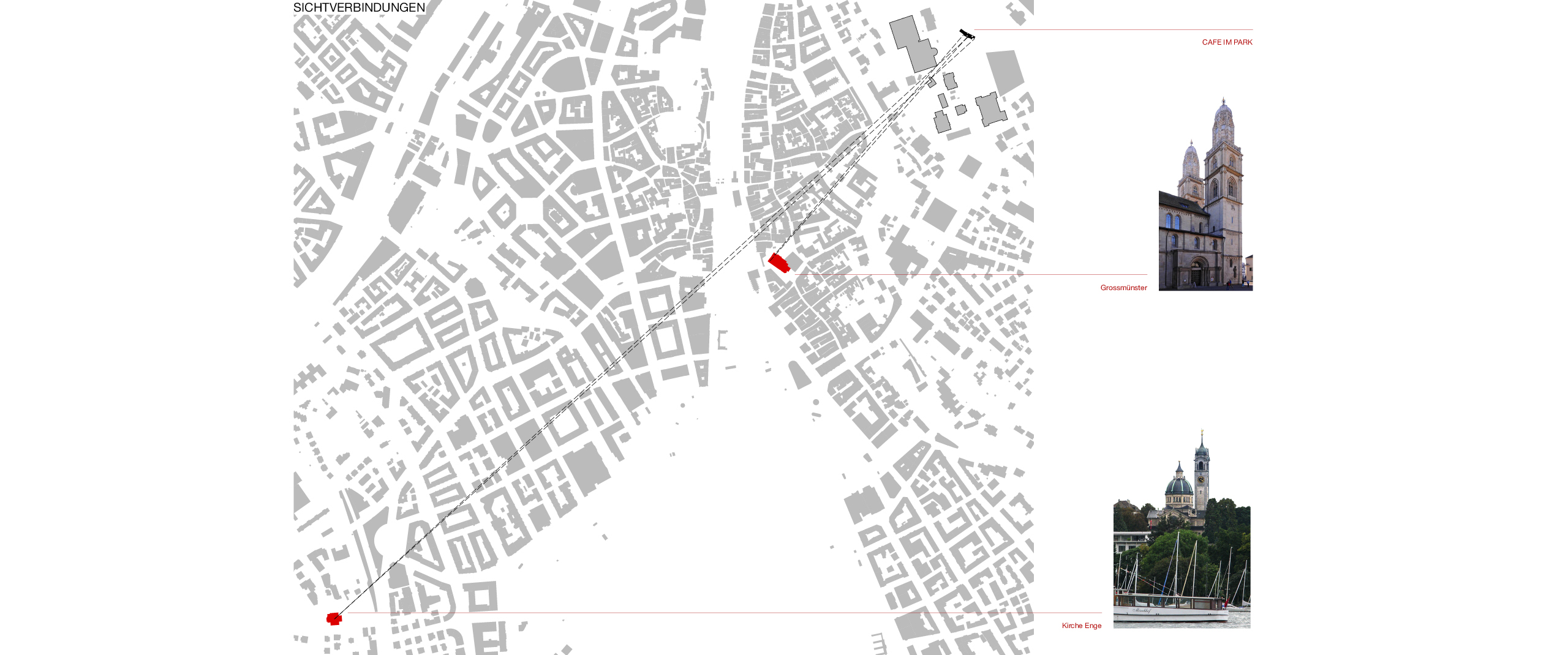 Das Volumen ist funktional in einen Publikumsbereich mit vorgelagerten Aussensitzplätzen und einen Produktionsbereich mit Lager-, Garderoben- und Technikräumen gegliedert. Der Publikumsbereich ist so angeordnet, dass er Blicke über die vorhandene Bebauung des Hochschulgebiets hinaus auf besondere Sehenswürdigkeiten der Stadt ermöglicht: Ausblicke auf die Türme des Grossmünsters und die Kirche Enge verankern den Pavillon präzise im grösseren Stadtgefüge.