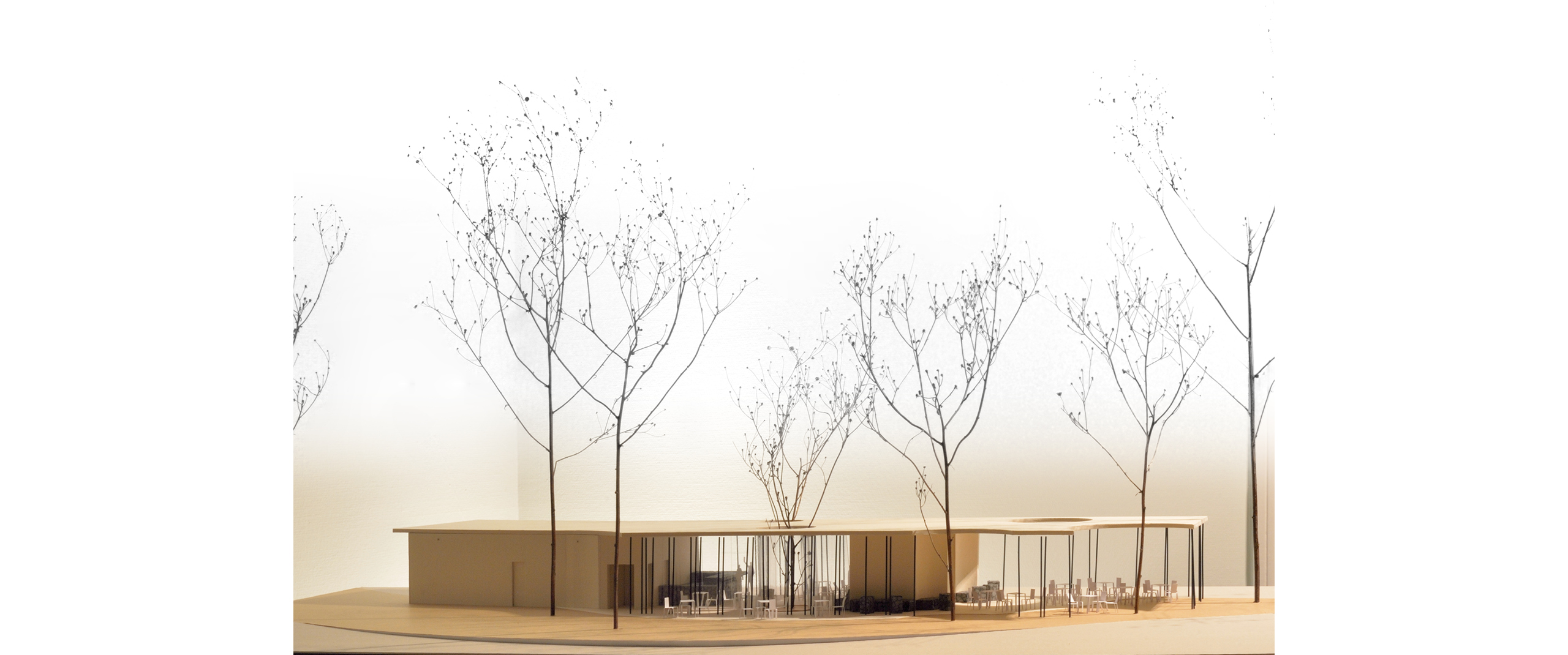 Den zur Stadt und zum Park hin transparente Gastraum teilen zwei zylindrische, baumbestandene, kreisrunde Höfe in vier unterschiedliche Bereiche. Die gläserne Umfassung dieser Höfe rückt - einem Terrarium gleich - den Aussenraum ins Innere und bietet ein gerahmtes Stück "Natur". Ein Vexierspiel von innen & aussen resultiert bei Blickbezügen durch den Pavillon. Was ist Innenraum? Was gehört zum Aussenraum? Grossflächige Schiebeelemente der Glasfassade schaffen bei schönem Wetter einen weiteren fliessenden Übergang von innen & aussen.