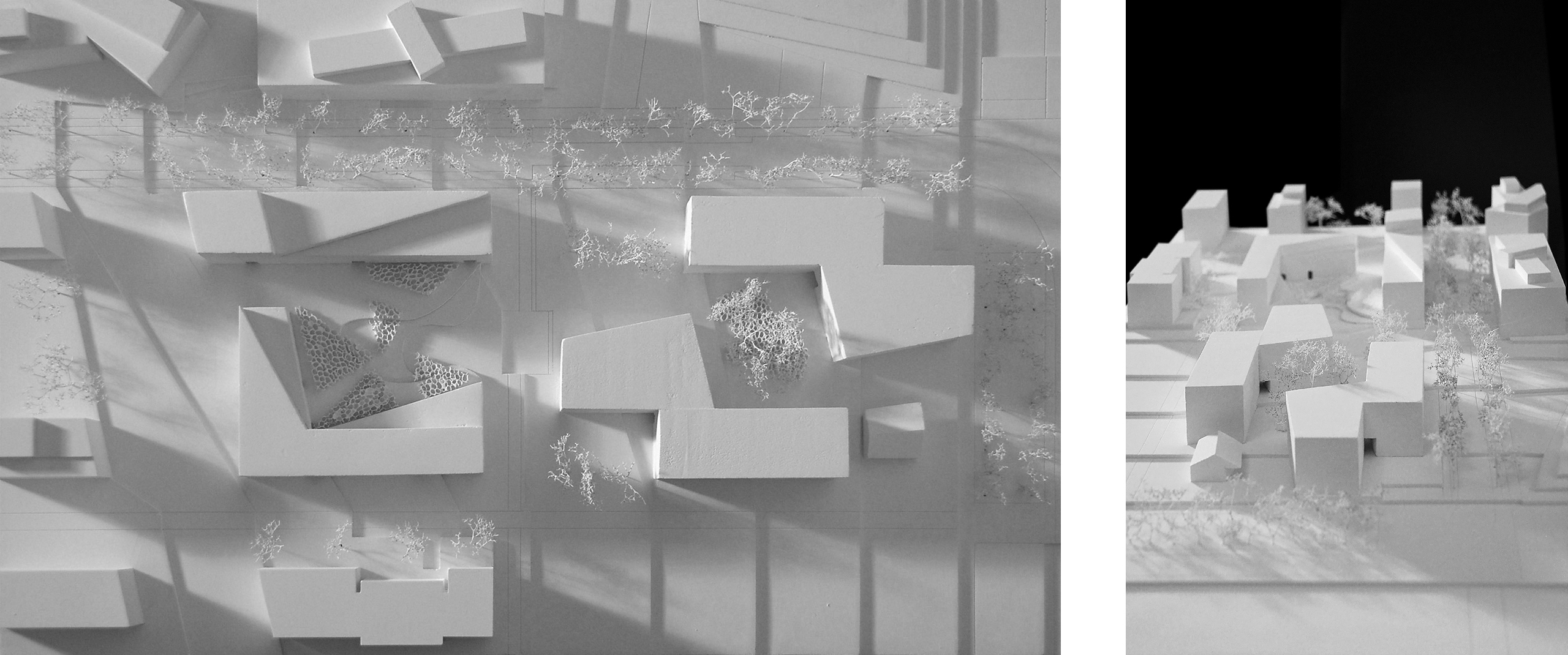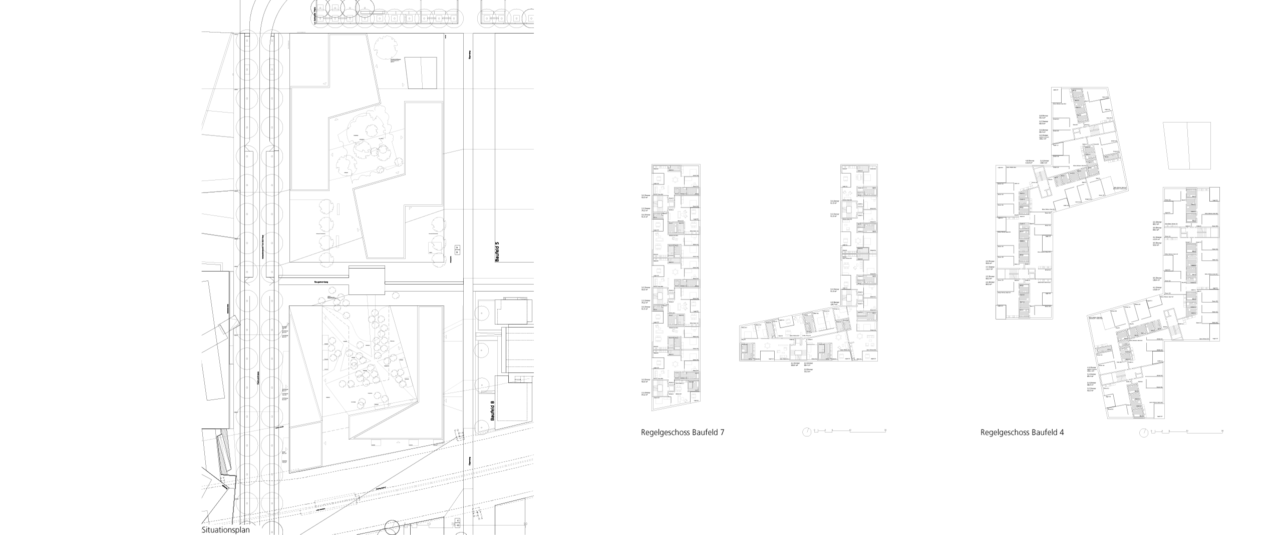 Das Baufeld 4 reagiert simultan: Hier ist es jedoch zweimal derselbe Gebäudekörper, der - gegeneinander verdreht - einen Hof aufspannt. Dieser wird mit Gehölzen und Bäumen dicht bepflanzt und tritt somit nicht als Hohlform, sondern "Grüne Masse" in Erscheinung. Ähnlich einer bewaldeten Schlucht fungiert dieser Hof als diagonale Abkürzung im etwas andersartigen "Grosstadtjungle"