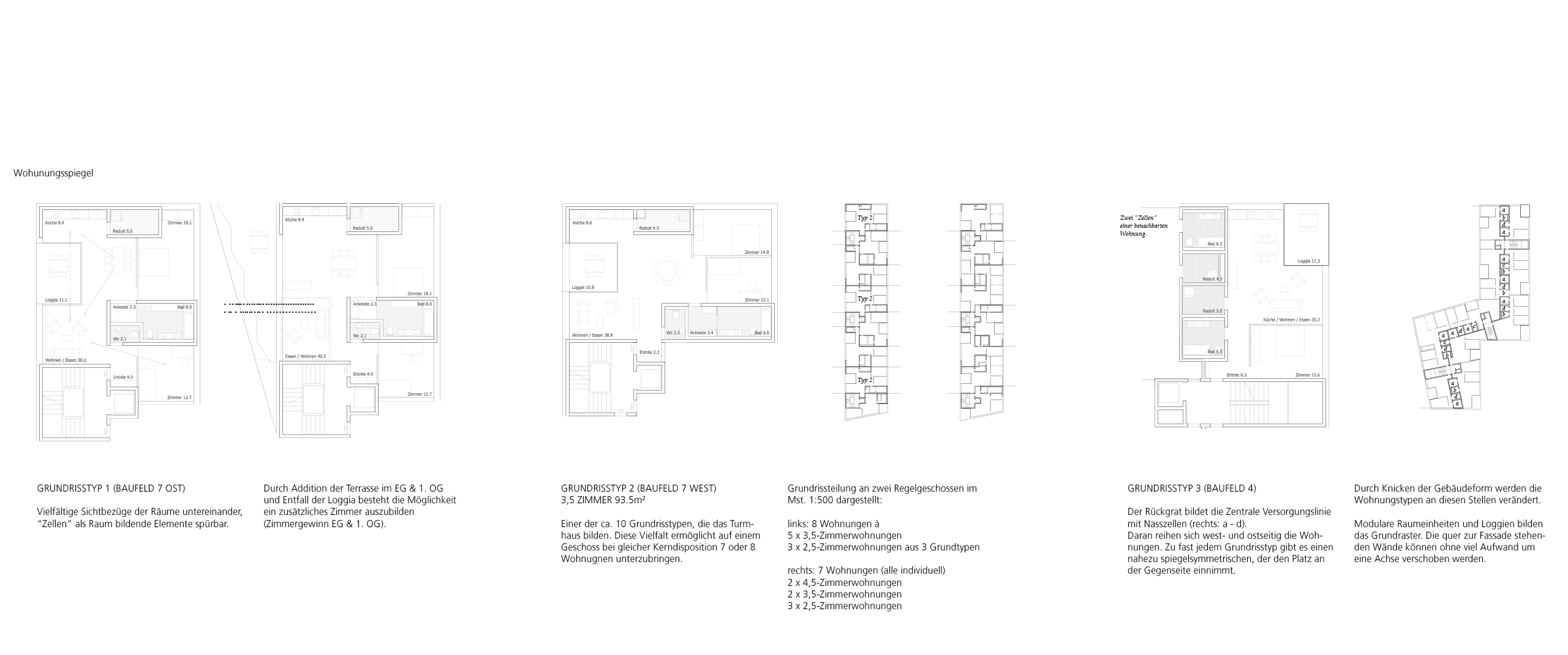 Die Gebäudestruktur setzt sich aus Zellen installierter Räume (Bäder, Reduits, Küchen, WCs) zusammen zwischen denen der "eigentliche" Wohnraum hin und her mäandriert. Diese Zellen übernehmen gleichzeitig die Tragfunktion. Geschossdecken lagern auf den abwechslungsweise ost- / westseitig angeordneten Minikernen. Dazwischen spannen sich stützenfrei die Räume auf. Gleichmässig über den Grundriss verteilte Schächte in den Zellen garantieren eine sehr hohe Flexibilität bei zukünftigen Aufteilungsänderungen. Unsere Gedanken gehen zeitlich weiter als die Ideen von "Schaltzimmern". Wir haben uns die ganze Lebensdauer eines Gebäudes vor Augen geführt. Flexibilität und die Möglichkeit, spätere Eingriffe einfach vorzunehmen, erhöhen aus unserer Sicht den Gebrauchswert und vor allem die Gebrauchsdauer eines Objektes (graue Energie - Ökologie).