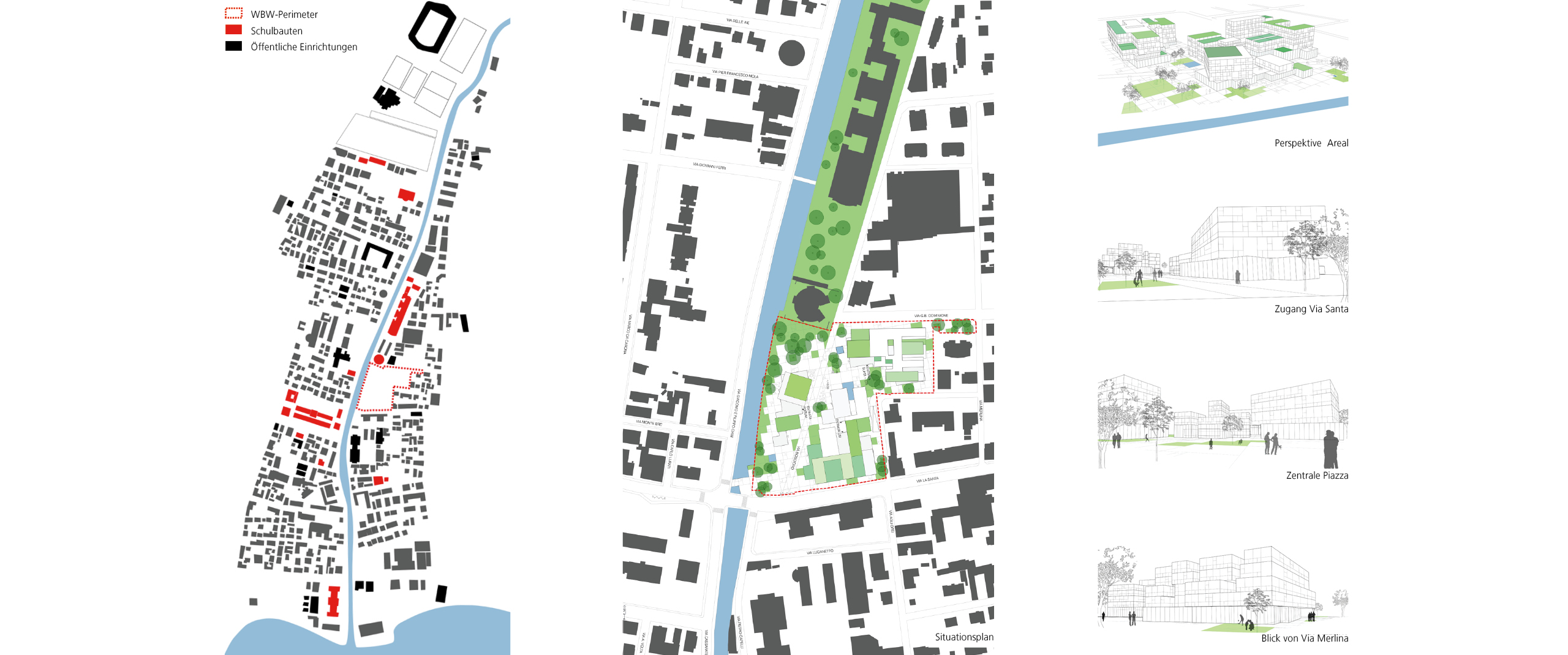 Die Fluss-Promenade mit ihren freien Körpern bleibt ein System von "Gebäuden im Grünen" (mit vorwiegend publikumsfrequentierten Nutzungen). Die Gebäudehöhen bleiben tief. Auf der gegenüberliegenden Seite der Via Boscaria wird das bauliche Programm des "institutionellen Lernens und Forschens" konzentriert: Eine dichtere und höheren Bebauung resultiert.
