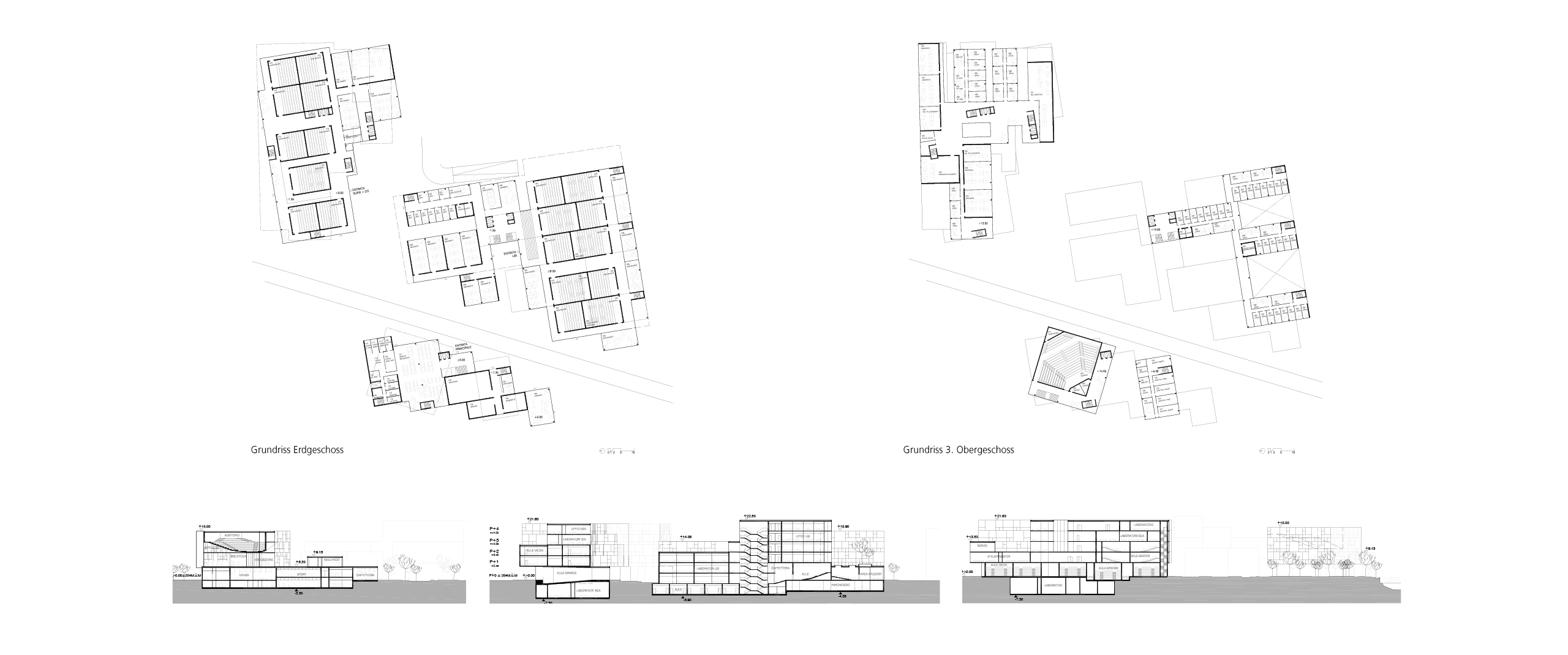 Während die gleichartige Ausrichtung im Erdgeschosse die drei Körper zusammen bindet, reagieren die Obergeschosse jeweils individuell auf die umgebenden Bauten und Strassenräume. Das Raster wird hier zur Umgebungslinie gedreht. Diese Verdrehung - im Innern ablesbar an den Kernen - schafft äusserlich eine bewusste Verortung. Die entstehenden Scherflächen erhöhen die Durchlässigkeit des Gebäudes und ermöglichen das Eindringen von Licht, Luft und Sonne als Postulate der Moderne auf sinnliche Weise. Sämtliche Büros und Vortragssäle sind mit natürlichem, direktem Tageslicht ausgestattet.