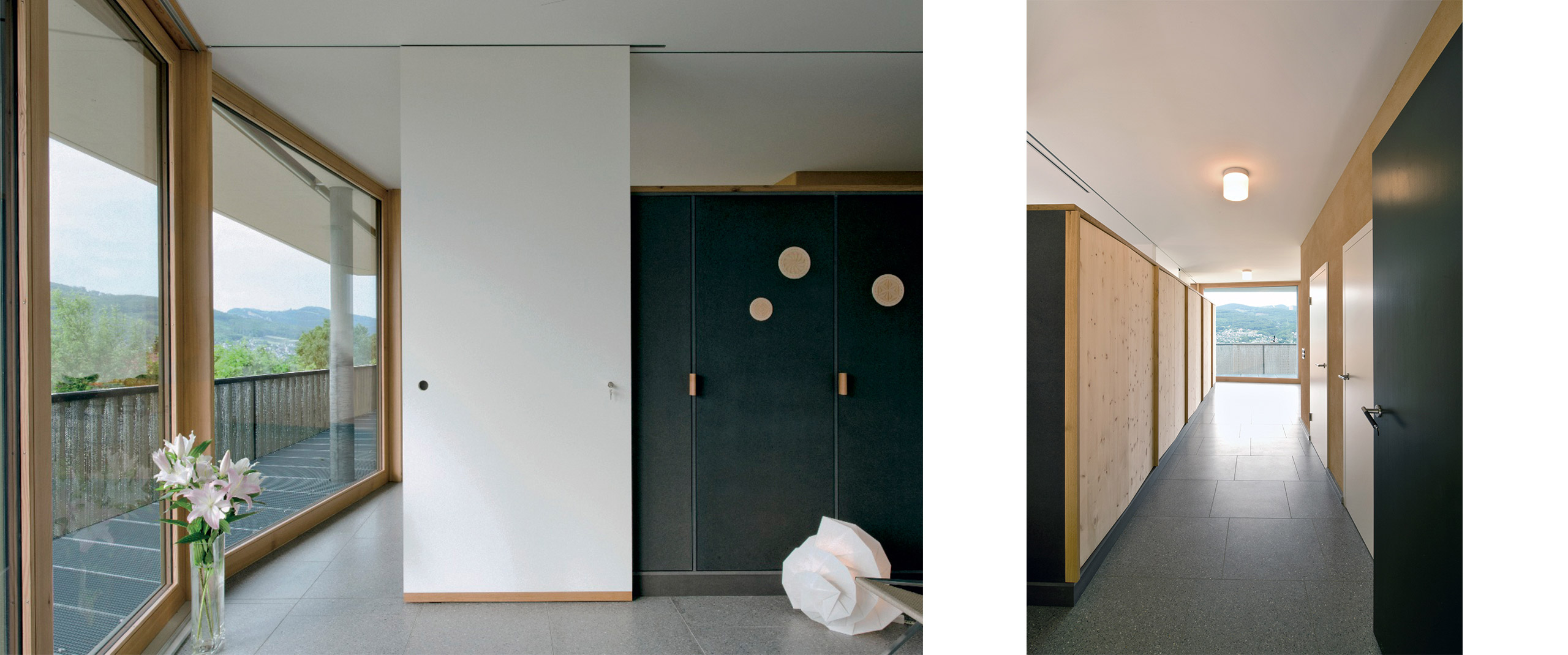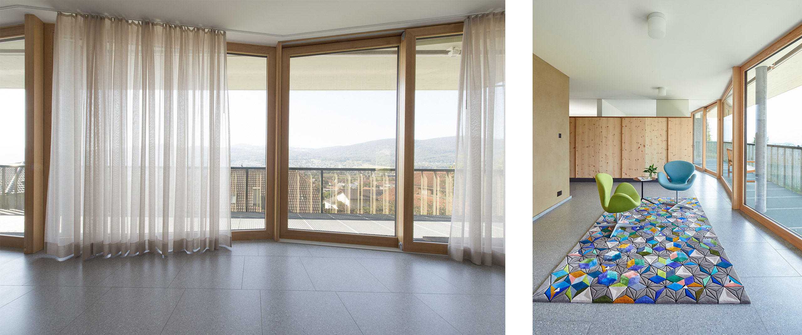 Badezimmer, Küche und Reduit sind in einem gemeinsamen Kern zusammengefasst. Die asymmetrische Plazierung dieses Kerns erzeugt im Grundriss unterschiedlich breite Zonen und reagiert so auf die jeweilige Nutzung und deren Platzbedarf.