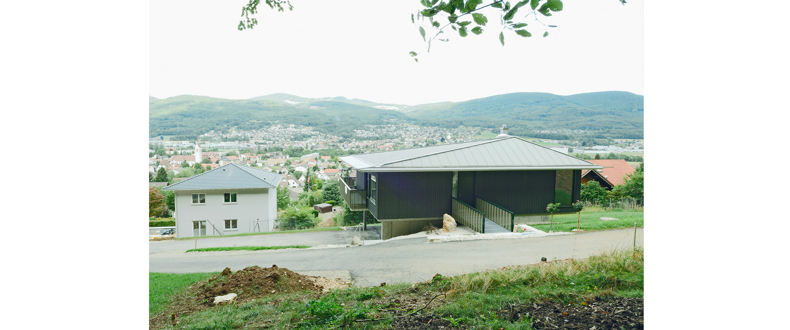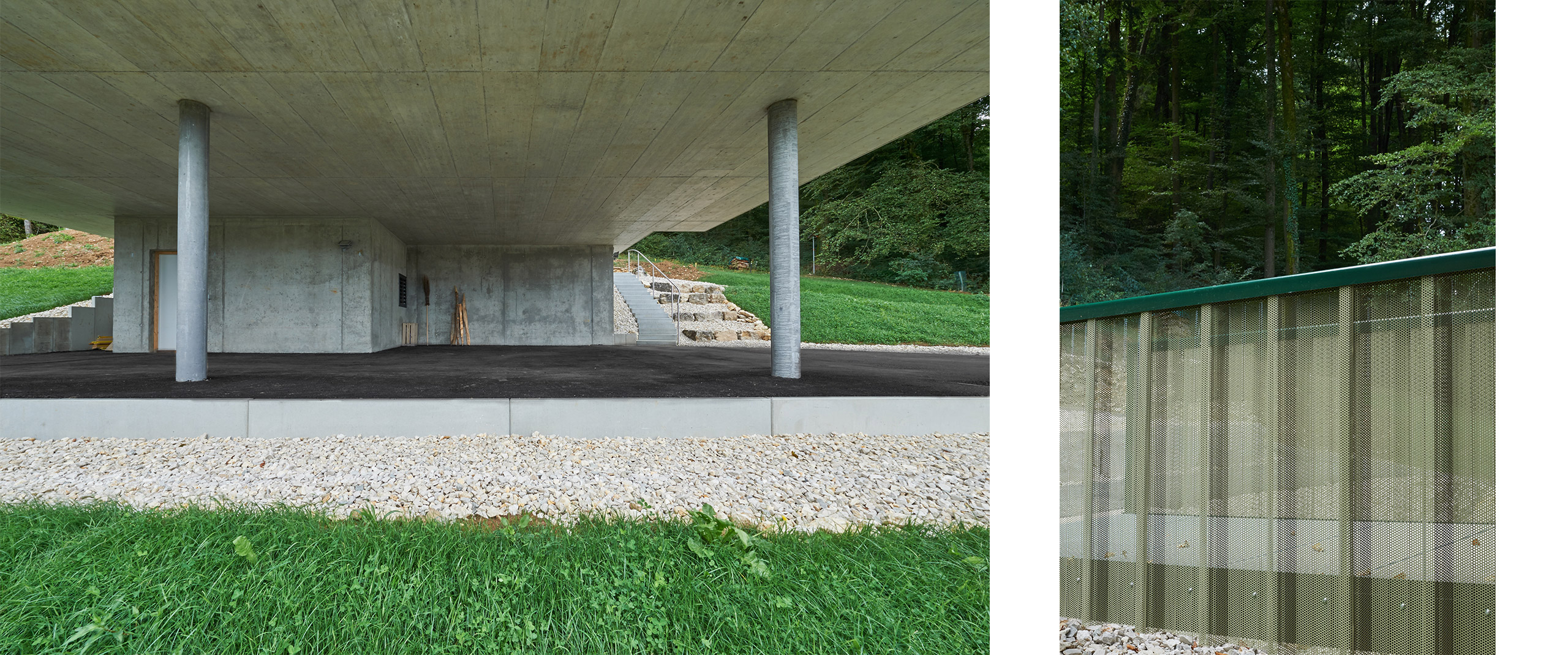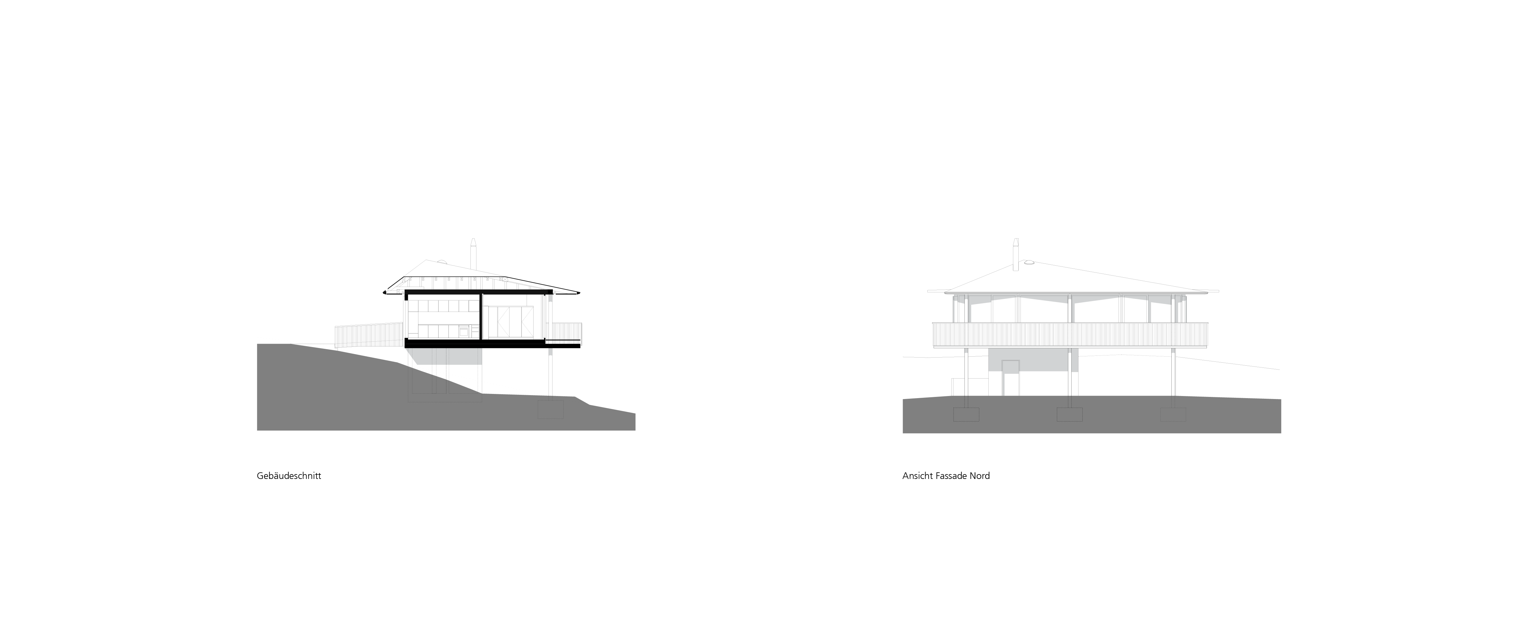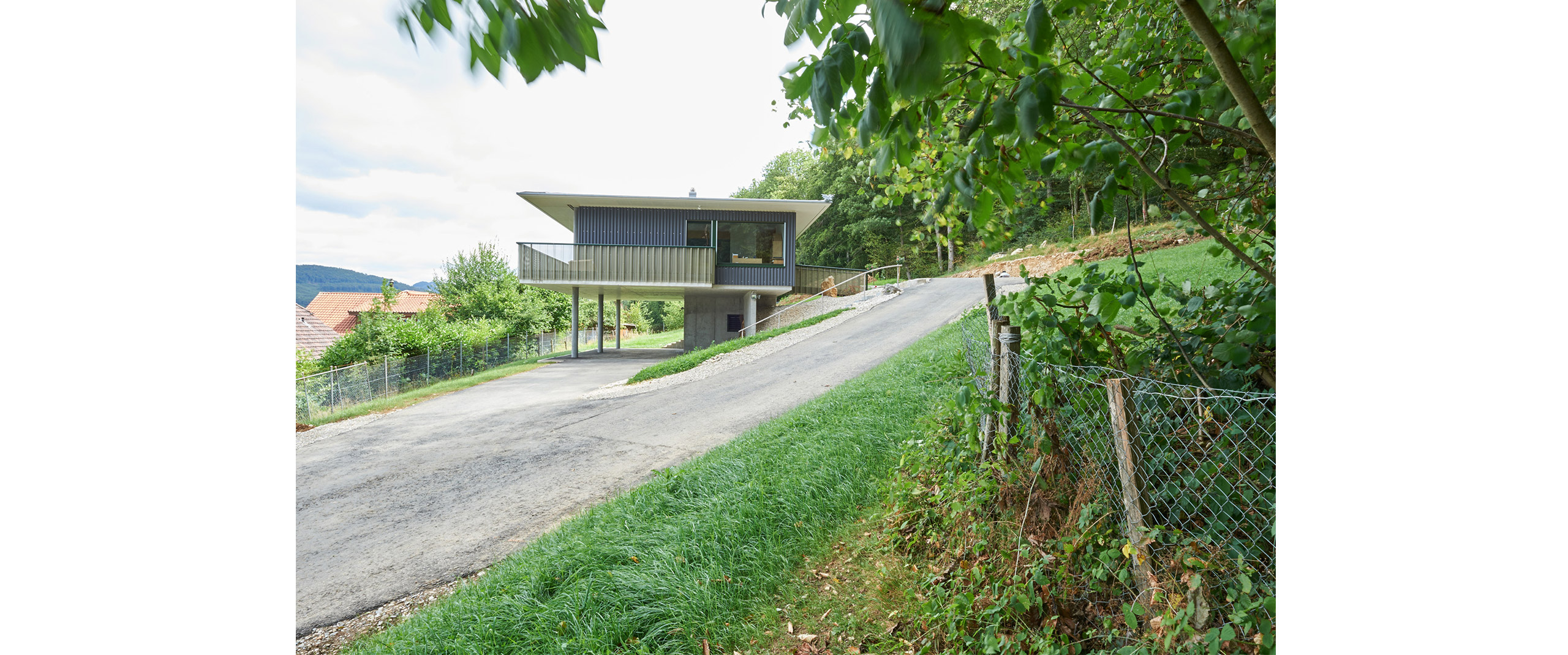 Das steile, felsige Gelände nährte die Idee eines aufgestelzten Bauvolumens und ermöglicht bergseitig das Gebäude ebenerdig zu betreten. Mit seinem flachen, pyramidalen Dach und der dunkel gewellten Eternithülle nimmt sich das Gebäude vor dem hohen Waldsaum zurück.