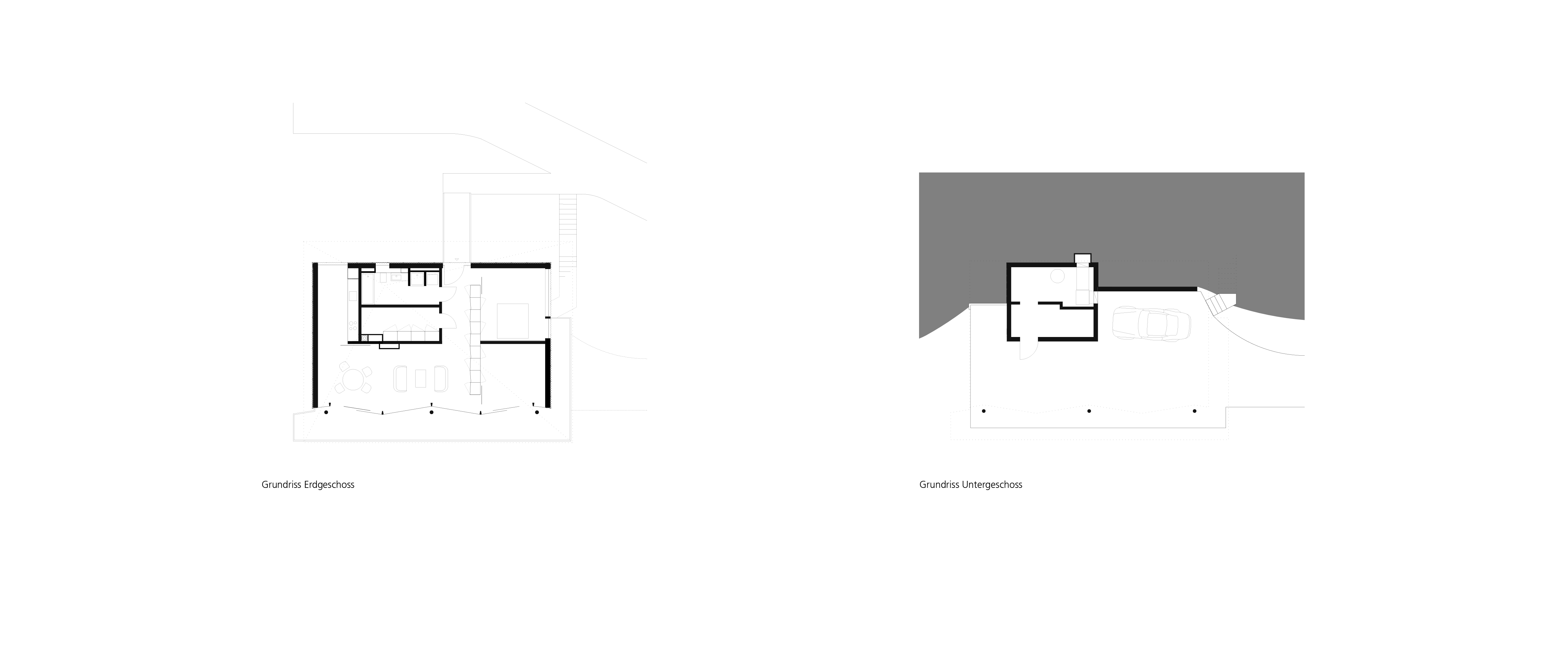 Die beheizten Wohnräume als Leichtbau in Holz mit dem weit auskragenden Dach stehen auf einem „Betontisch“. Dessen Beine bilden der Heizungskern und drei Ortbetonstützen. Unter dem „Tisch“ steht Raum für das Verstauen der verschiedenen Land- und Forstmaschinen des Eigentümers, sowie für seinen Autoabstellplatz zur Verfügung.