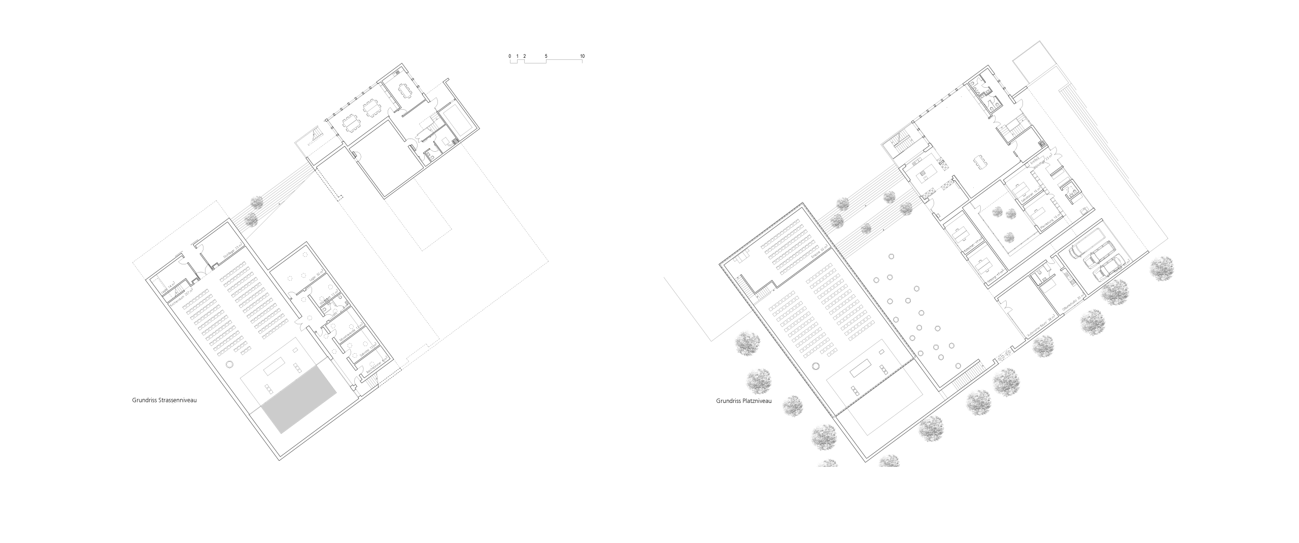 Mitten im Wohnquartier von Seon liegt das Grundstück mit der Kirche und den dazugehörigen Nutzungen. Das Projekt ’Laterne’ setzt der dort vorhandenen typischen Struktur von Solitären, welche mitten auf ihrem Grundstück stehen und durch einen grünen Gürtel ihre Privatheit nach aussen abschirmen, einen öffentlichen Raum entgegen. So werden sämtliche kirchlichen Nutzungen um den neuen Kirchplatz versammelt. Es entsteht ein Ort der Begegnung und des Verweilens ausserhalb des eigenen Gartenzaunes. Der Platz wird zwischen dem bestehenden Pfarrheim mit angebautem Pfarramt und der neuen Kirche aufgespannt. Das Glockentor betont seine Bedeutung als Kirchplatz. Trotz seiner klaren räumlichen Ausrichtung und Fassung durch die umliegenden Gebäude ergeben sich mehrere mögliche Zugänge und somit viele Möglichkeiten des Begehens und sich Begegnen. Sei es über den schmalen Baumgarten südlich, welcher den Uebergang in die Landschaft der umliegenden privaten Gärten schafft oder über die repräsentative Treppenanlage.