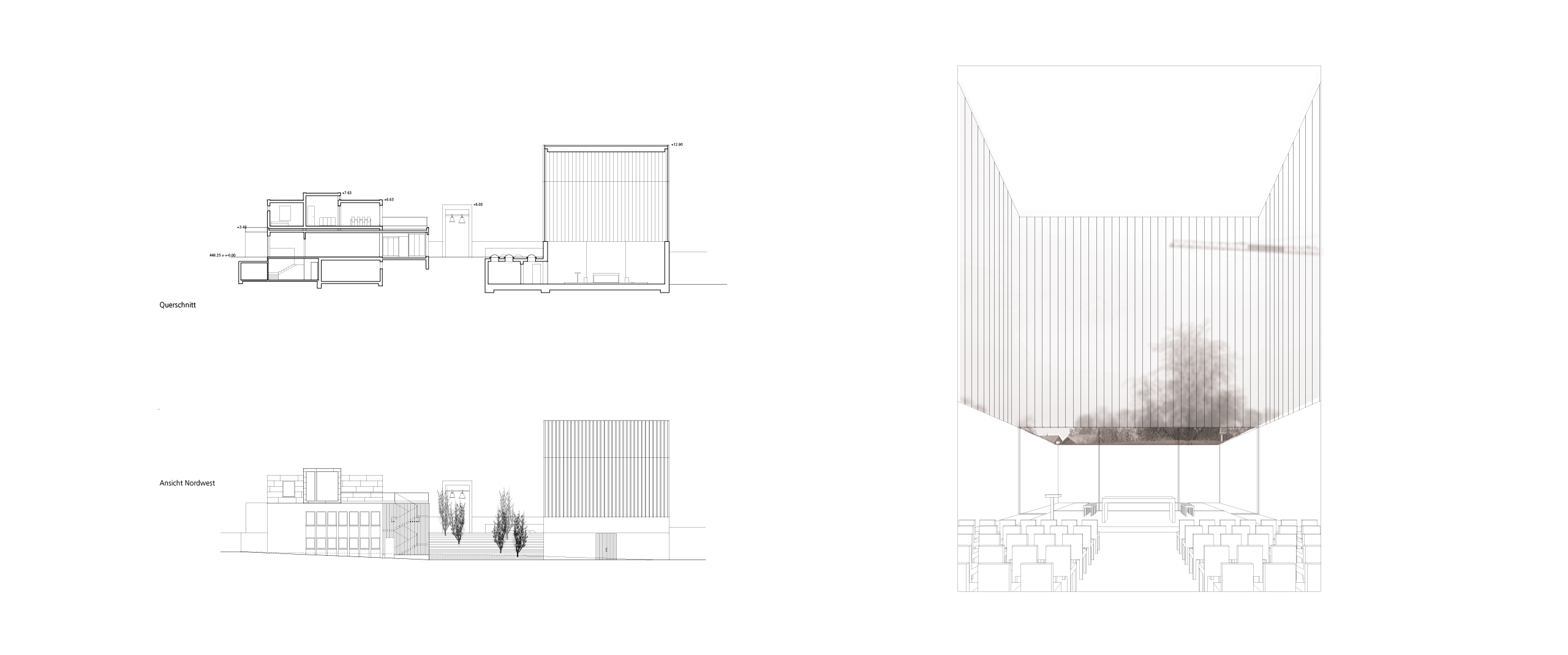 Die Kirche steht als Solitär am Ende der Stichstrasse. Der Körper gliedert sich in die bestehende Struktur ein, indem er sich aus dem Hang hinaus entwickelt und sich talwärts, zur Strasse ausrichtet. Von dieser erfolgt der Zugang zum Innenraum. Der präzise und reduzierte Sockel aus Sichtbeton trägt eine in den Himmel strebende, gläserne Haube aus Profilitglas. Die transluszente ’Laterne’ bricht tagsüber das Sonnenlicht und taucht den Innenraum in eine sinnliche Atmosphäre. Nachts bündelt sie das künstliche Licht des Innenraumes und strahlt - einem Kristall gleich - weithin sichtbar aus. Im Innenraum öffnet sich der Blick über den Chorraum in den Innenhof, welcher in stark reduzierter Form einen Bezug zur Aussenwelt darstellt. Darin befindet sich ein Wasserbecken, welches zum Spiegel des Himmels wird. Der Hofraum bildet in seiner Abgeschiedenheit und Ruhe das Gegenstück zum Kirchplatz. Die zurückhaltende und minimale Materialisierung des Kirchenraumes soll für den Besucher Ausgangspunkt und Projektionsfläche eigener kontemplativer Gedankengänge sein.