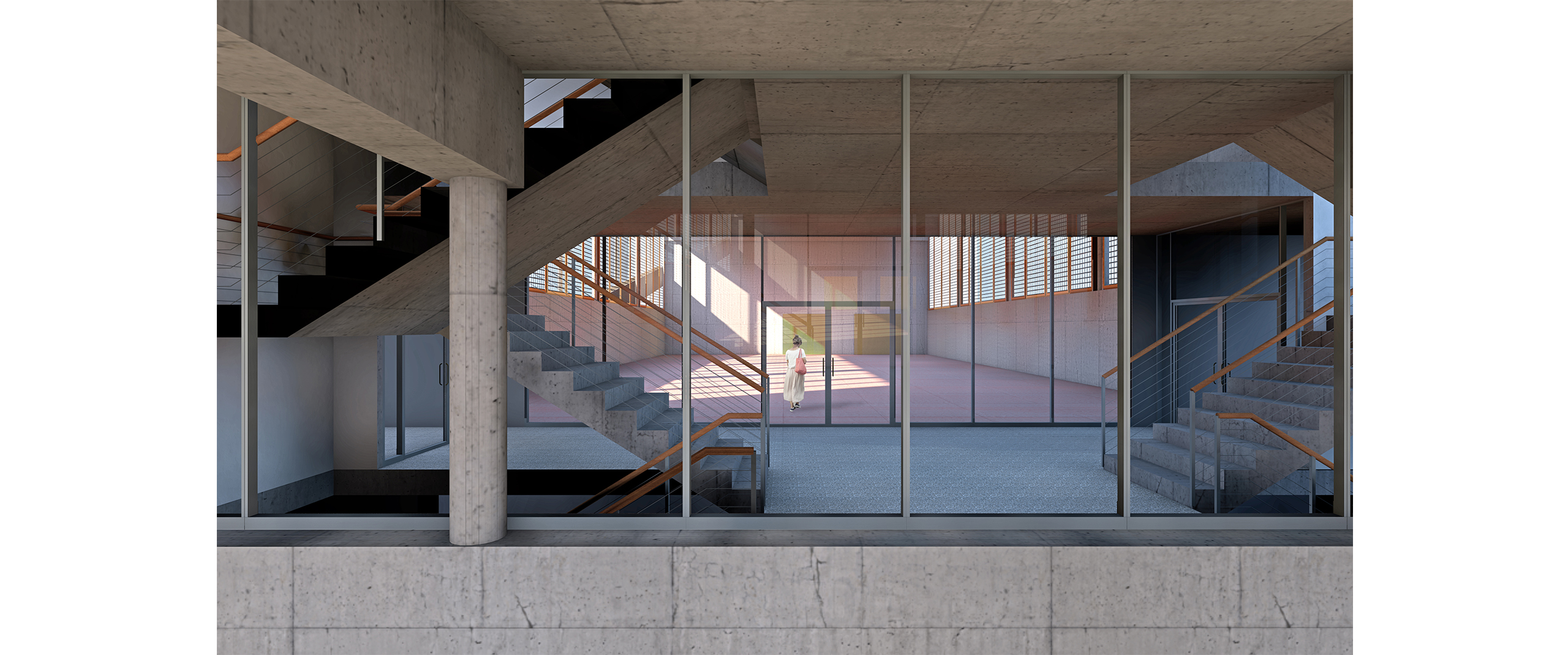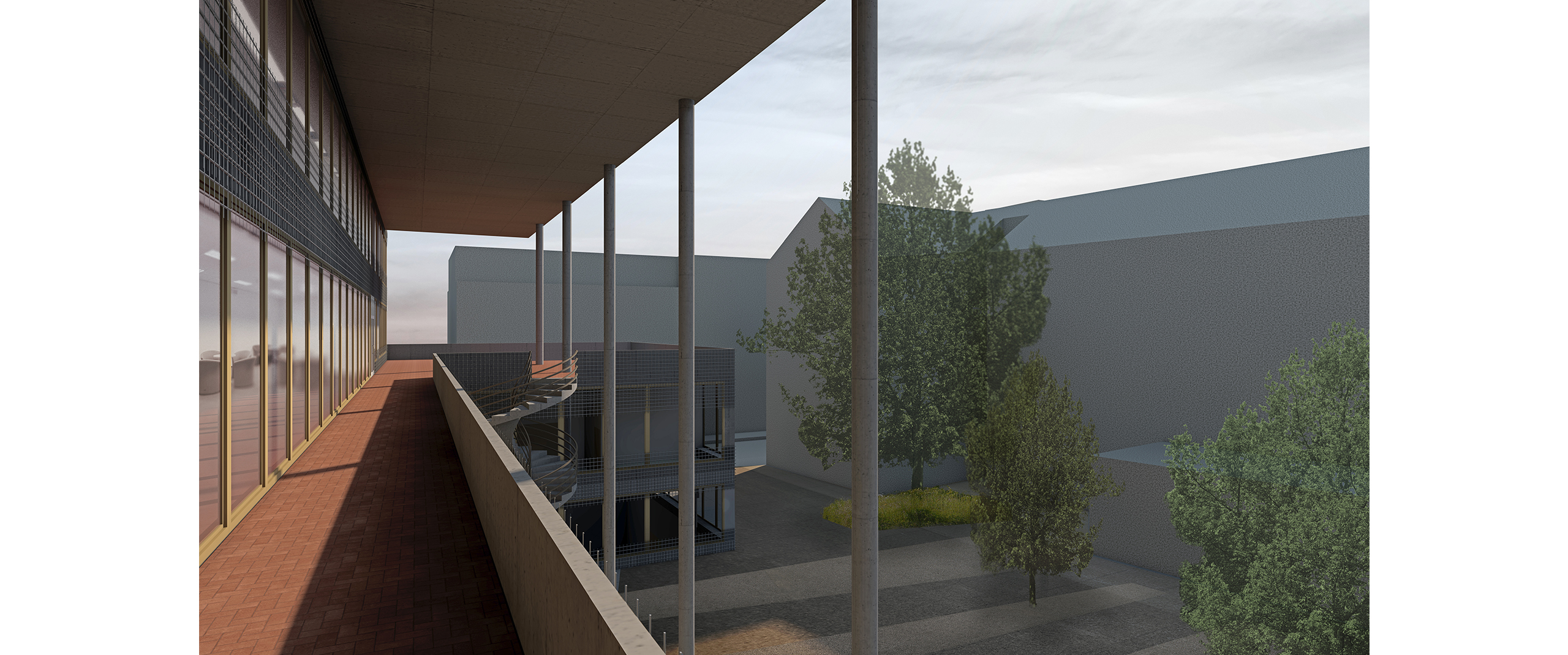 Die aus dem bestehenden Wegrecht definierte Durchfahrt liegt in Verlängerung der Baumstrasse. Sie dient der Erschliessung des grossen Innenhofes. Dieser bildet das Herzstück der neuen Anlage. Vom Strassenlärm abgeschirmt entsteht ein vernetzter Raum der seine Qualitäten auch über die Verknüpfung unterschiedlicher Geschosse ausspielt. Eine 4-geschossige Säulenhalle ist das Schaustück des Hofes. Das Thema des Portikus wird hier nochmals – in einem anderen Massstab als beim strassenseitigen Haupteingang der Schule – wiederholt. Im Schatten der Säulen führen Rampen und eine Wendeltreppe auf unterschiedliche Niveaus. Die „Promenade architecturale“ spannt über die gesamte Gebäudelänge und führt bis ins 2.Obergeschoss, vorbei an Schaugärten und Pflanzensammlung. Das "Gartenzimmer" – ein höher gelegener Frischluftsaal – orientiert sich zum Schaugarten. Sein Rücken bilden die Platanen des angrenzenden Museumparks. Direkt an Treppenhaus und Korridor angebunden, kann dieser Raum im Sommer als Aussenschulzimmer oder ganzjährig als überdachter Pausenraum genutzt werden. Ein 50 Meter langer „Wandelgang“ verbindet den Schaugarten und Gartenzimmer mit der im Südosten gelegenen Dachterrasse. Auch hier besteht eine Anbindung an die gebäudeinterne Erschliessung. Eine skulpturale Wendeltreppe führt im Aussenraum von der Dachterrasse auf das Erdgeschossniveau zurück. Hier sind direkte Zugänge zum Turnhallentrakt, Aufenthaltsraum der Studierenden und Mehrzweckraum vorgesehen. Tanzende Kiesflächen im Asphaltbelag bilden spezifische Aufenthaltsbereiche innerhalb des Hofes. Einzelne blühende Akazienbäume und eine freie Möblierung bespielen die Fläche. Rückseitig liegen Veloparkplätze, deren räumlicher Abschluss ein grüner Vorhang bildet.