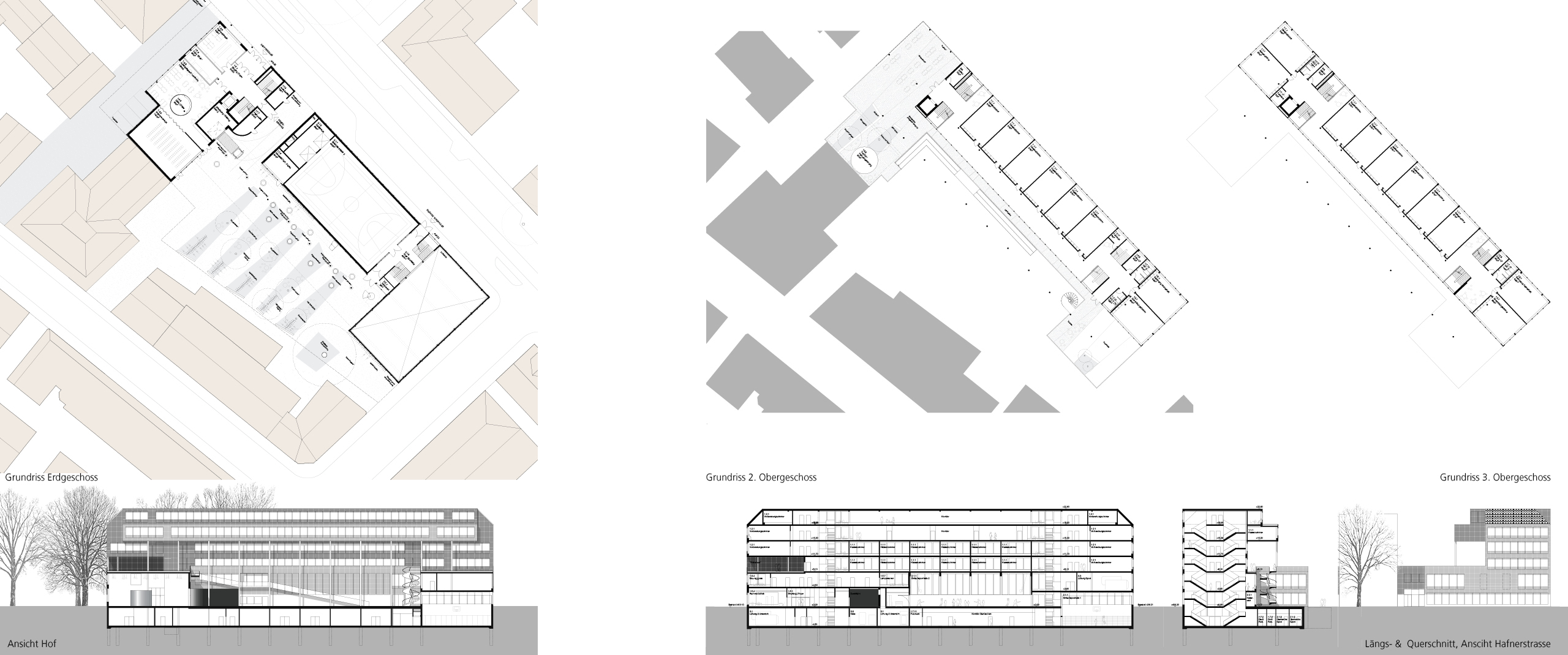 Der eigentliche Schultrakt ist in Anlehnung an Schulbauten der klassischen Moderne als schmaler Riegel ausformuliert. Ab dem 2. Obergeschoss sind die Klassenzimmer einbündig mit stirnseitig angehängten zudienenden Räumen angeordnet. Entlang der einseitigen Erschliessung sind jeweils bei den Treppenhäusern Arbeitsnischen eingefügt. Der durchlaufende Erschliessungskorridor verbindet die beiden doppelläufigen Treppenhäuser. Diese münden in die getrennten Eingänge Berufsschule und Sporthallen.