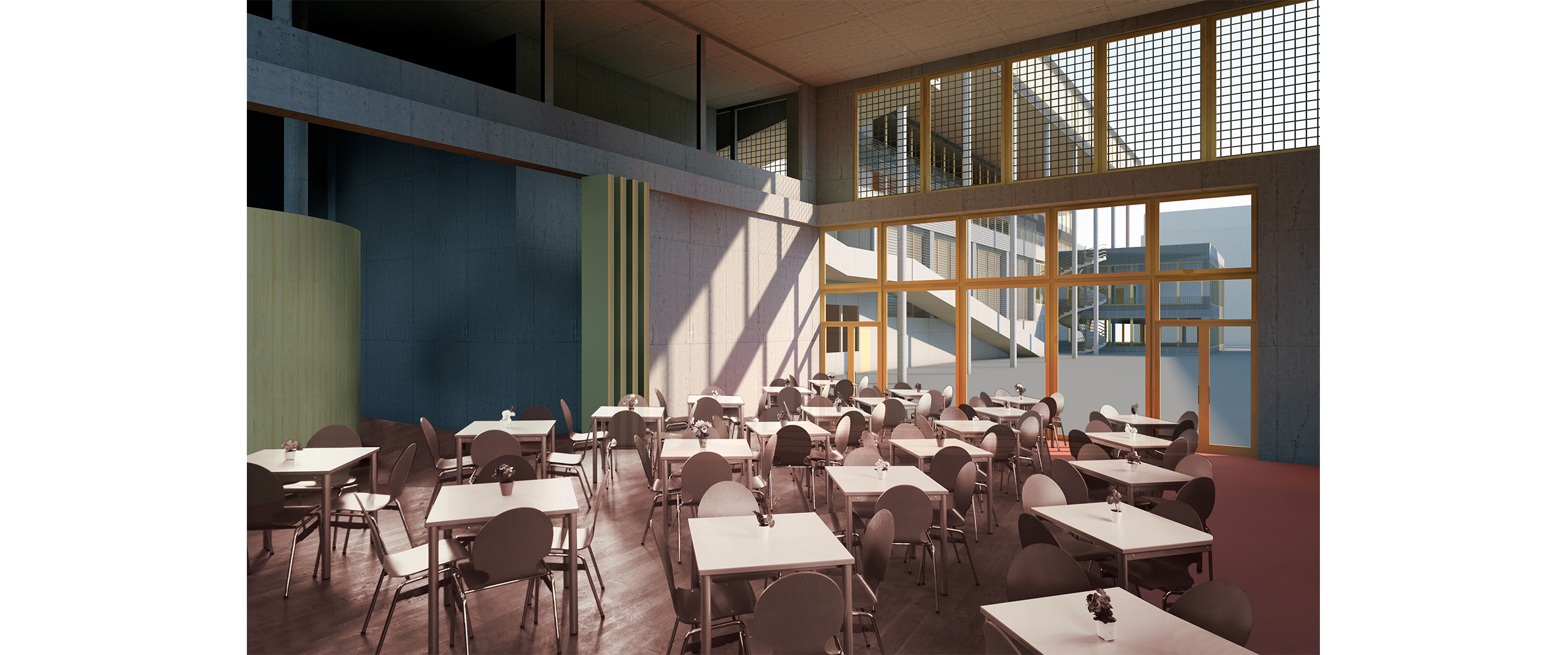Die tragende Struktur des neuen Gebäudes wird aus Stahlbeton geplant. Basis des Tragwerksentwurfs ist die Skelettbauweise mit einem klaren Grundprinzip und durchgehenden Stützen und Wänden für einen direkten Lastabtrag ohne Umwege. Eine einzige Ausnahme stellen die beiden stützenfreien Turnhallen dar. Hier wird der mittlere Stützenstrang aus den darüberliegenden Geschossen mithilfe der hohen Stahlbetonträger abgefangen. Auch die Fassadenstützen aus dem 5.OG werden nach demselben Prinzip abgefangen. Die Aussteifung des Gebäudes erfolgt mittels Stahlbetonkerne. Diese verlaufen über die gesamte Gebäudehöhe und umschliessen die Treppenhäuser. Die geplanten Stützen tragen nur vertikale Lasten ab und verlaufen im Wesentlichen bis zum Dachgeschoss durch. Eine Holzbauweise im Dachgeschoss wäre denkbar und auch aus Gewichtsgründen von Vorteil. Brandschutztechnisch wäre das oberste Geschoss in Holzbauweise ohne Zusatzmassnahmen umsetzbar. Sämtliche Geschossdecken sind als unterzugfreie Flachdecken geplant und spannen zwischen 5,50m und 10.75m. Eine Um- oder Nachinstallation ist damit richtungsunabhängig unter der Decke ohne Kollisionen mit der tragenden Struktur möglich. Entlang der Deckenränder wird ein Überzug ausgebildet um die Verformungen der Deckenstirn zu minimieren. Bei der Wahl der tragenden Struktur wurden mögliche Umnutzungen stets bedacht. Sämtliche Trennwände zwischen den Klassenzimmern sind nicht-tragend und können beliebig in der Lage verändert werden.