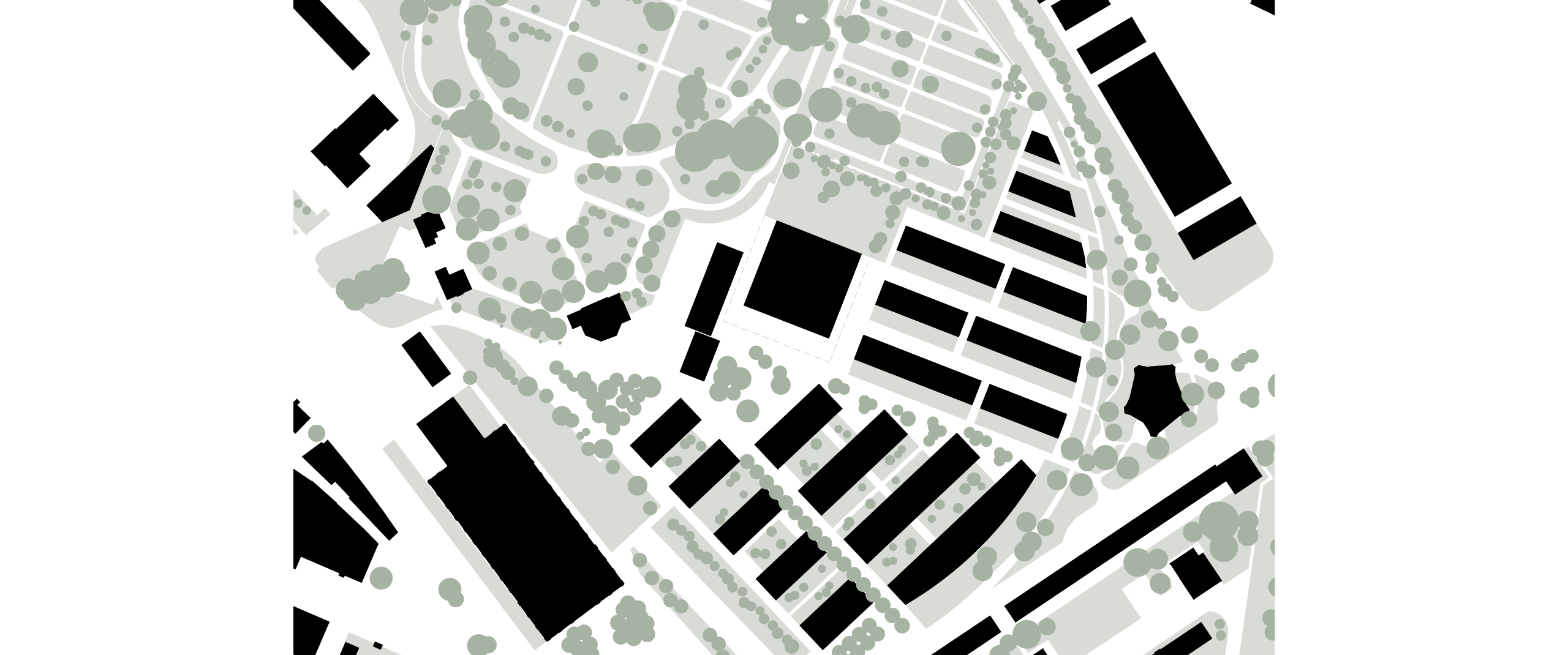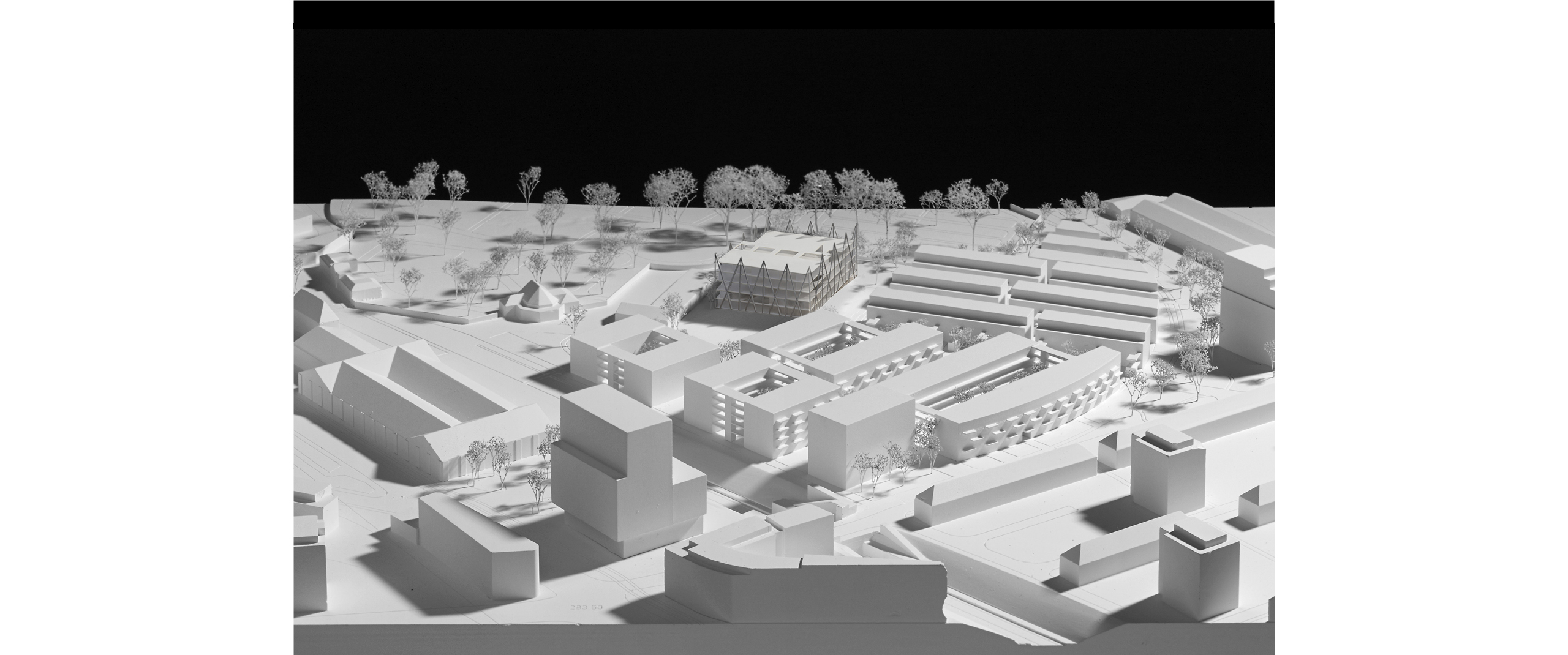 Das Schulhaus markiert das Zentrum des neuen Quartiers und sitzt im Mittelpunkt des Gleisbogens. Es orientiert sich gleichermassen zum Quartierplatz wie auch zur Pausenwiese auf der Nordseite. Abgerückt von den Zeilenbauten im Osten und in der Volumetrie an die Hofbebauung im Südosten angelehnt, vermittelt das Schulhaus zwischen Quartiergrenze (Gleisbogen) und den Baufeldern A-D. Seine Zentrumsfunktion wird auch in der vierseitig gleichwertigen Fassadengestaltung aufgegriffen. Subtil reagiert sie auf den Terrainverlauf und schafft mit der verlängerten Diagonalstruktur im Norden eine zusätzliche Belichtungssituation für die Turnhalle im Untergeschoss. Zugänge an allen drei zum Quartier ausgerichteten Fassaden ermöglichen flexibel auf die noch folgenden Entwicklungen des Orts zu reagieren und zeigen sinnbildlich ein für alle offenes Haus.
