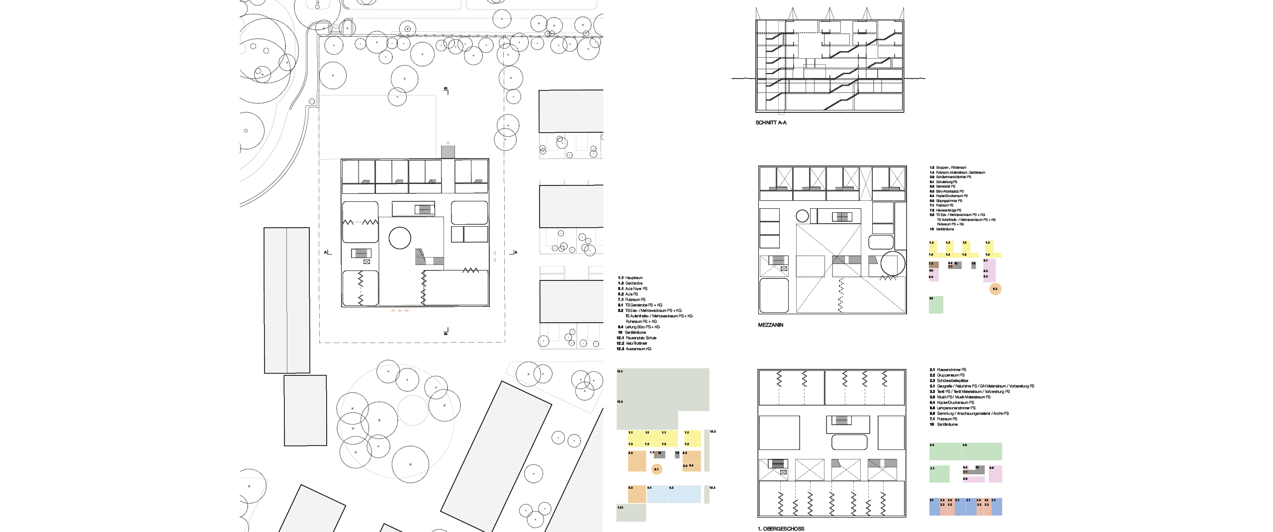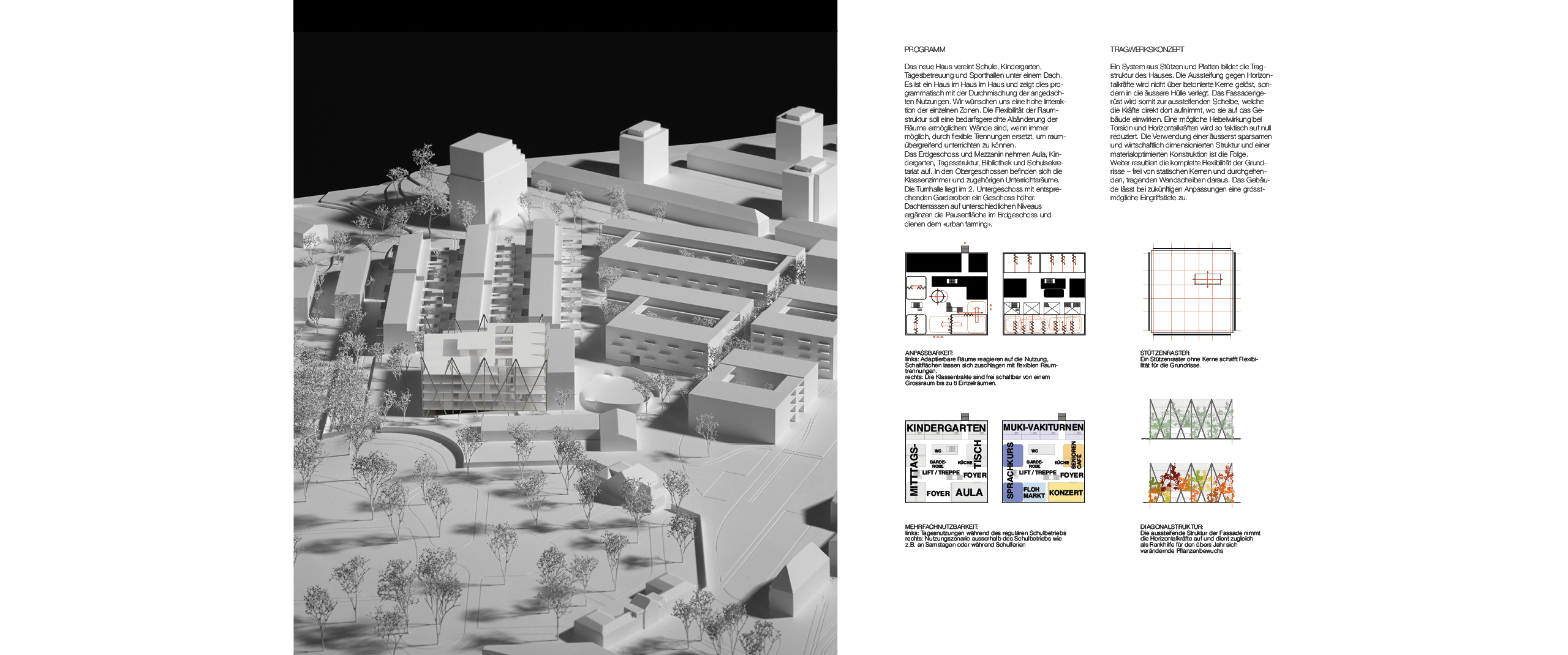 Das neue Haus vereint Schule, Kindergarten, Tagesbetreuung und Sporthallen unter einem Dach. Es ist ein Haus im Haus im Haus und zeigt dies programmatisch mit der Durchmischung der Nutzungen. Wir wünschen uns eine hohe Interaktion der einzelnen Zonen. Die Flexibilität der Raumstruktur soll eine bedarfsgerechte Abänderung der Räume ermöglichen: Wände sind, wenn immer möglich, durch flexible Trennungen ersetzt, um raumübergreifend unterrichten zu können.Das Erdgeschoss und Mezzanin nehmen Aula, Kindergarten, Tagesstruktur, Bibliothek und Schulsekretariat auf. In den Obergeschossen befinden sich die Klassenzimmer und zugehörigen Unterrichtsräume. Die Turnhalle liegt im 2. Untergeschoss mit entsprechenden Garderoben ein Geschoss höher. Dachterrassen auf unterschiedlichen Niveaus ergänzen die Pausenfläche im Erdgeschoss und dienen dem "urban farming".