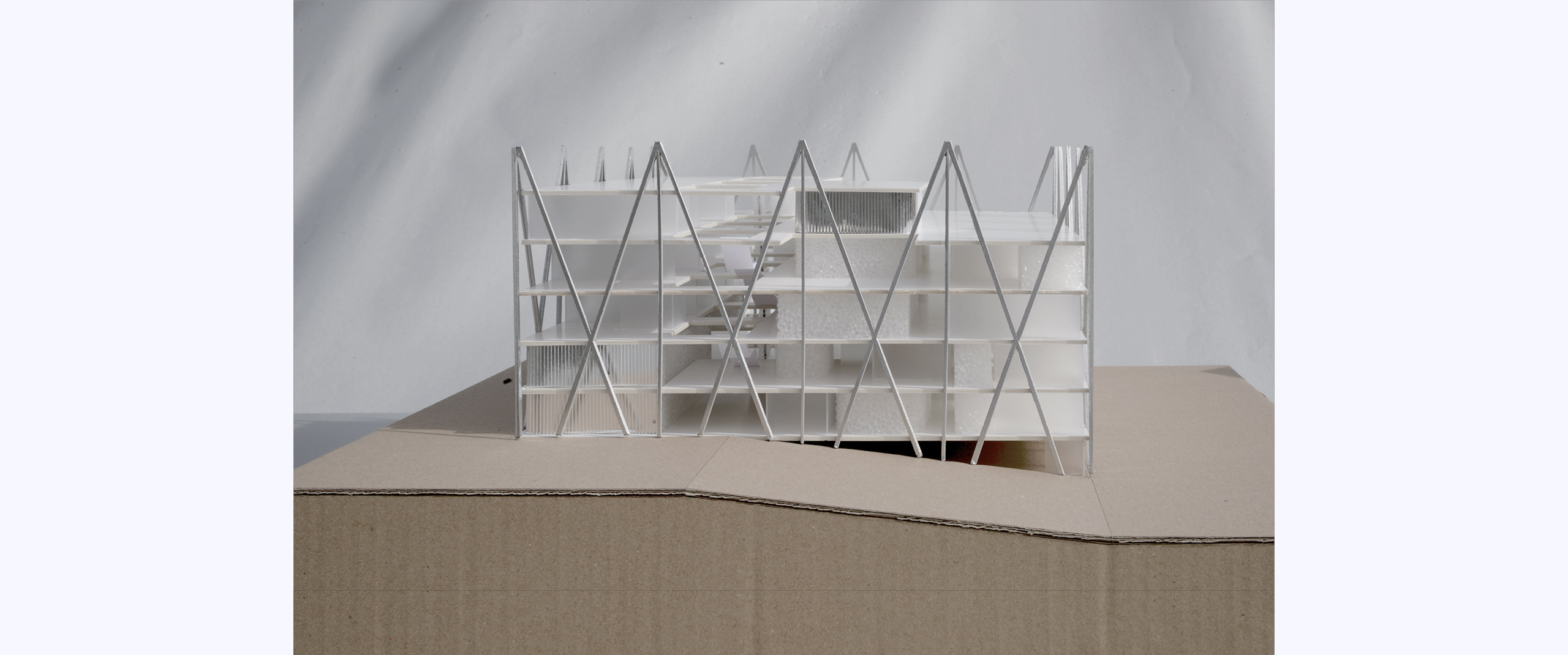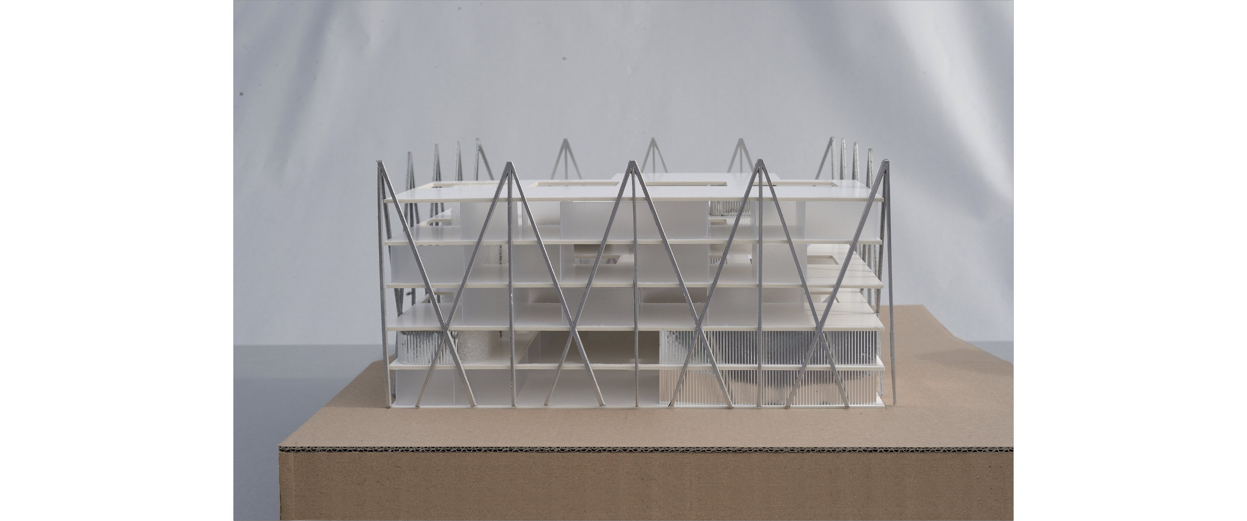 Ein System aus Stützen und Platten bildet die Tragstruktur des Hauses. Die Aussteifung gegen Horizontalkräfte wird nicht über betonierte Kerne gelöst, sondern in die äussere Hülle verlegt. Das Fassadengerüst wird somit zur aussteifenden Scheibe, welche die Kräfte direkt dort aufnimmt, wo sie auf das Gebäude einwirken. Daraus resultiert die komplette Flexibilität der Grundrisse - frei von statischen Kernen und durchgehenden, tragenden Wandscheiben. Das Gebäude lässt bei zukünftigen Anpassungen eine grösstmögliche Eingriffstiefe zu.