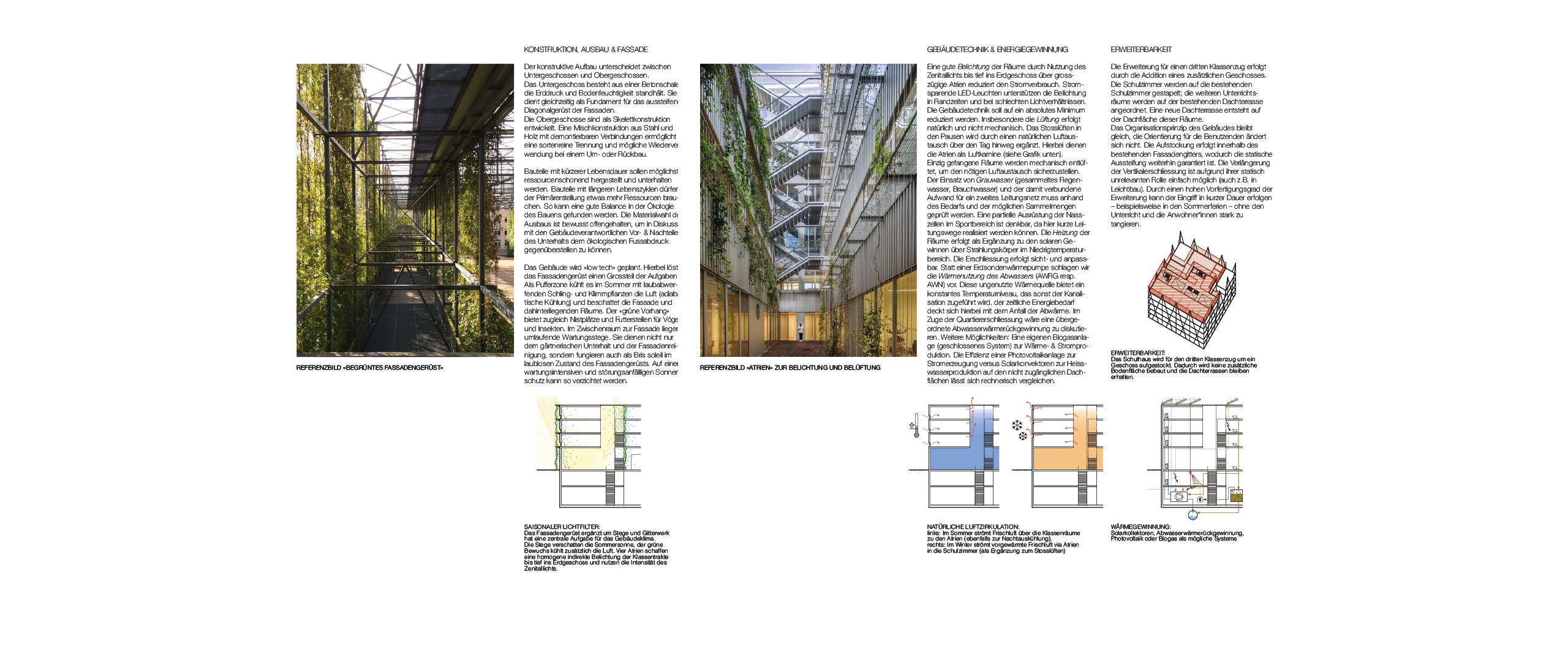 Das Gebäude wird "low tech" geplant. Hierbei löst das Fassadengerüst einen Grossteil der Aufgaben: Als Pufferzone kühlt es im Sommer mit laubabwerfenden Schling- und Klimmpflanzen die Luft (adiabatische Kühlung) und beschattet die Fassade und dahinterliegenden Räume. Der "grüne Vorhang" bietet zugleich Nistplätze und Futterstellen für Vögel und Insekten. Im Zwischenraum zur Fassade liegen umlaufende Wartungsstege. Sie dienen nicht nur dem gärtnerischen Unterhalt und der Fassadenreinigung, sondern fungieren auch als Bris soleil im laublosen Zustand des Fassadengerüsts. Auf einen wartungsintensiven Sonnenschutz kann so verzichtet werden.